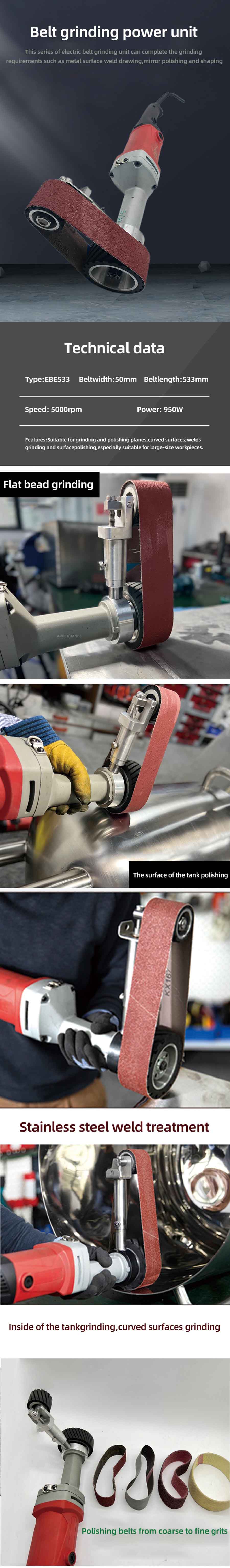 Suitable for grinding and polish curved surfaces, welds grinding and surface polishing, especailly suitable for large size workpiecs.