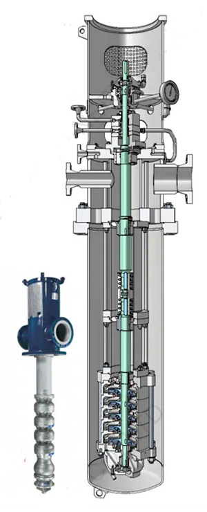 Vertically installed barrel pump, multi-stage, radially split, cylindrical shell, the first stage mostly adopts impeller with outstanding anti-cavitation performance. When the pressure difference is large, the balance drum structure is used to balance the axial force, and the residual axial force is borne by the paired angular contact ball bearings. The casing is only subjected to inlet pressure, and the length of the casing and the installation depth of the pump are determined by the requirements of NPSH cavitation performance.